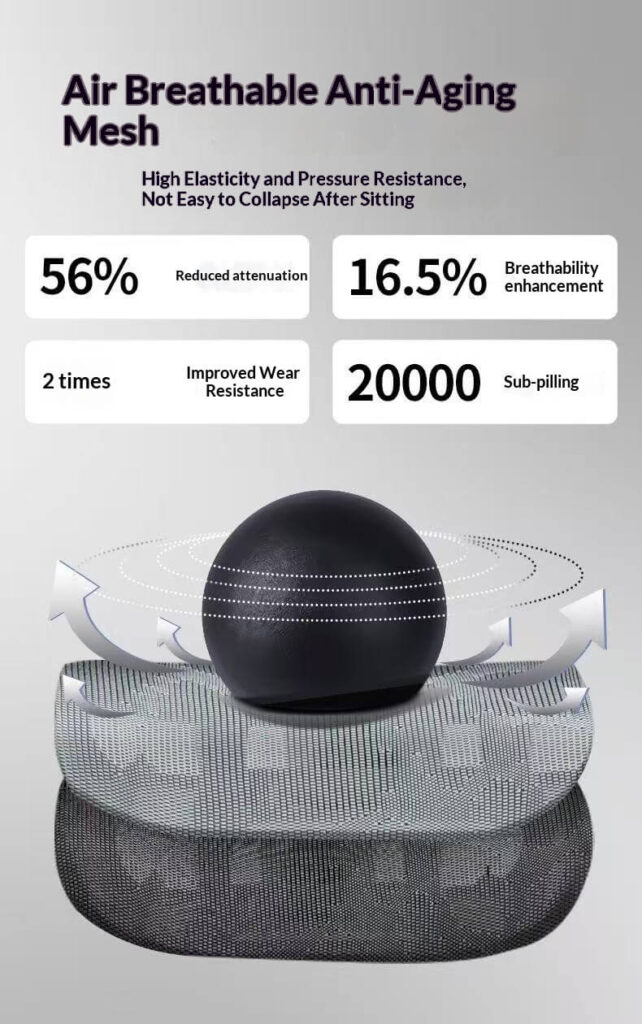 This chair’s air-breathable mesh offers 56% reduced attenuation, 2x wear resistance, and 16.5% enhanced breathability—built for long-term use.